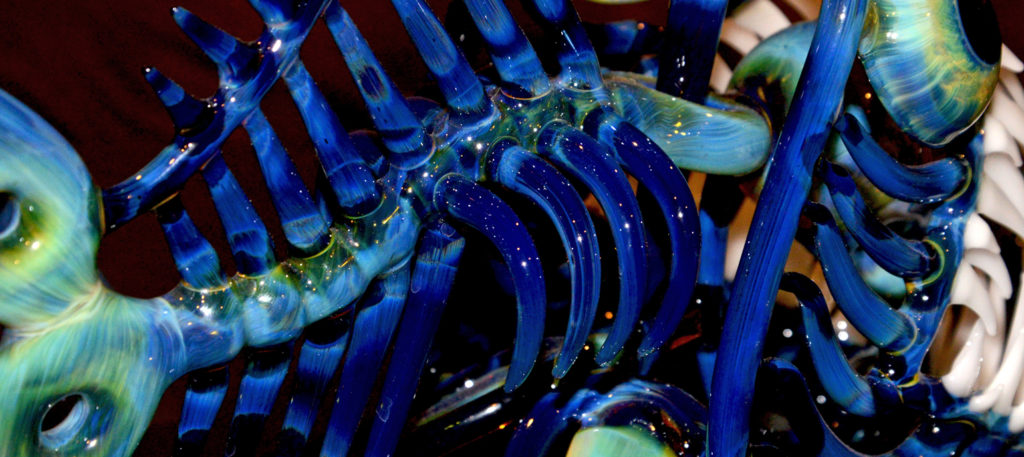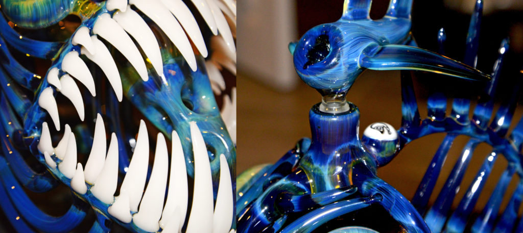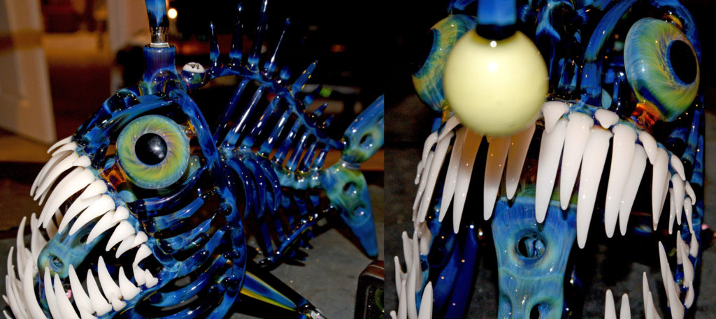 This is another piece in the angler fish line. It features a triple double function housed within the skeleton of the fish with a removable glow-in-the-dark angler esca. Featured at the Counter Culture Glass Show – Habatat Gallery, West Palm Beach, FL.