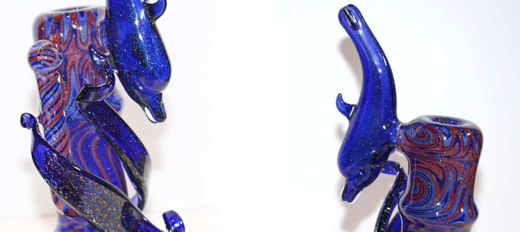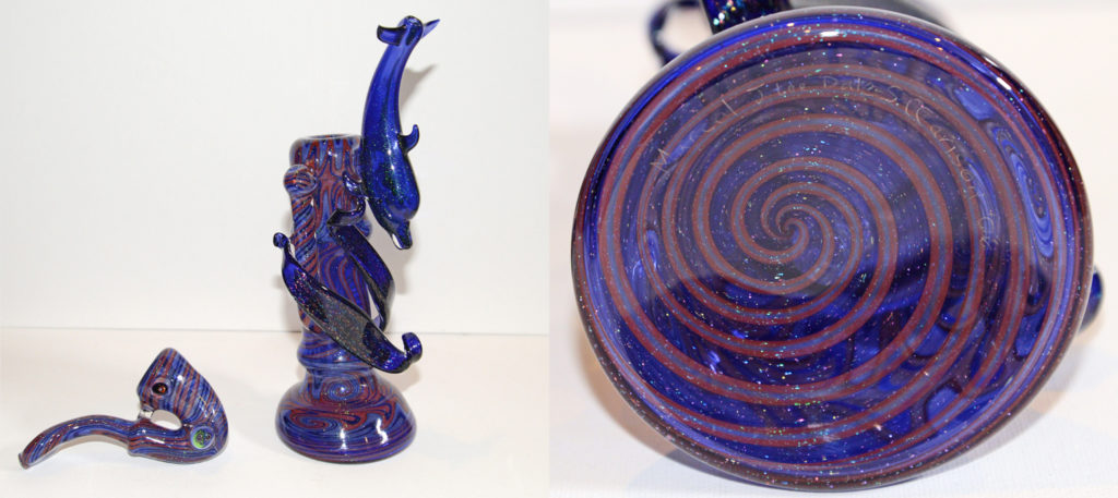 A stunning example of functional glass art from the older era of glass, before Glass on Glass joints were the norm; a beautiful push bowl bubbler made by some of the greatest artists to get on the torch in this industry. A must have for any true collector and enthusiast of this movement.