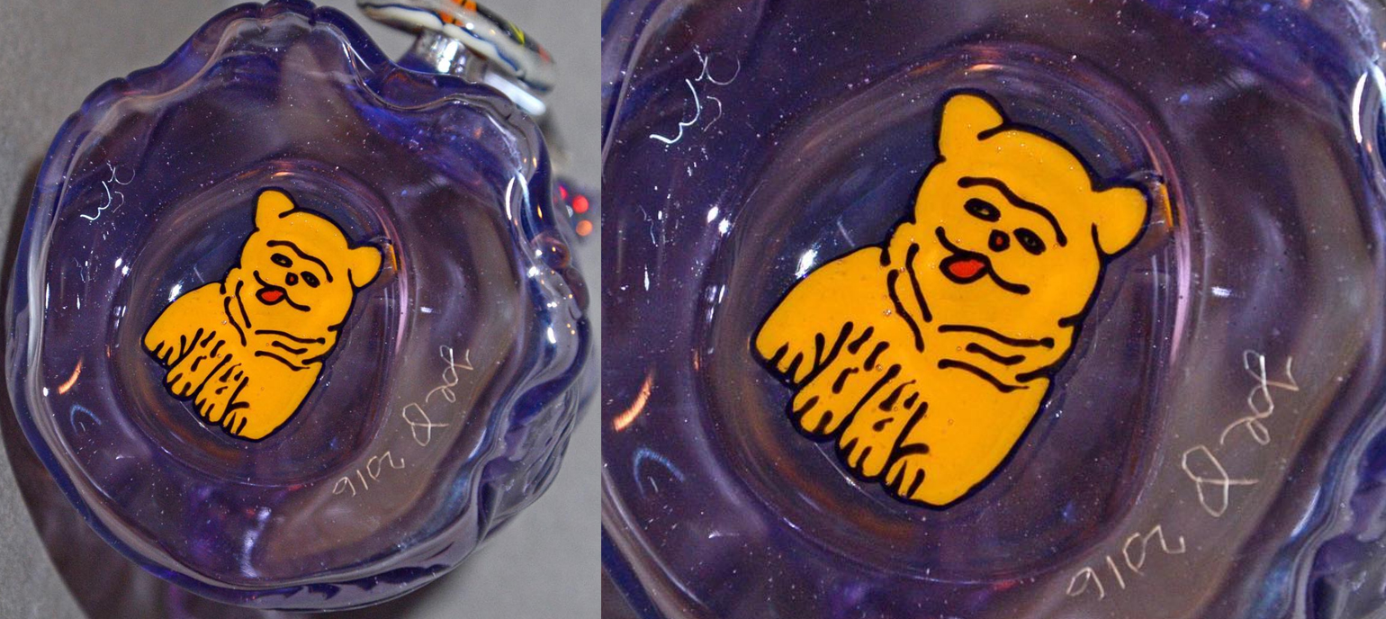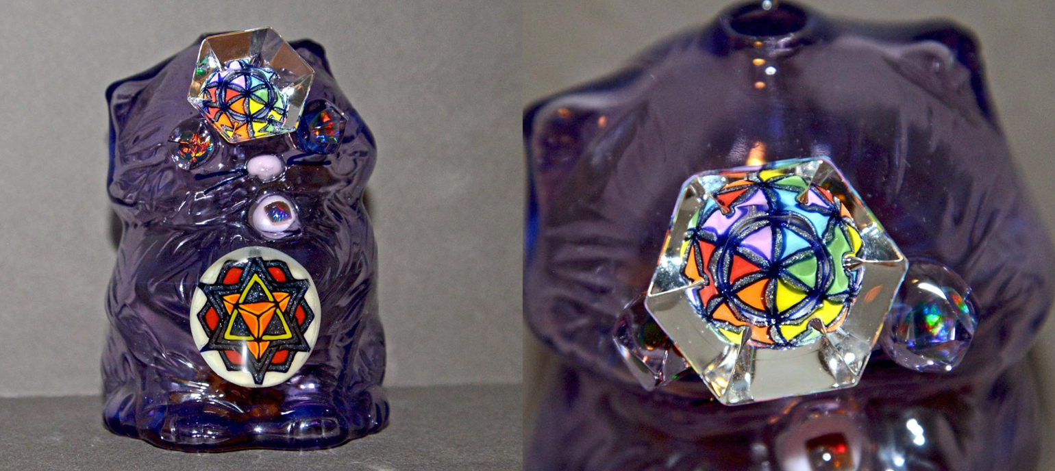 The ever elusive Lasercat makes a return with some additions by WJC in the flip department. Jewel 3rd eye, sacred geometry front cab, and a lasercat flip on the bottom! Sculpted beautifully by Joe P in the CFL reactive Purple Potion color.
