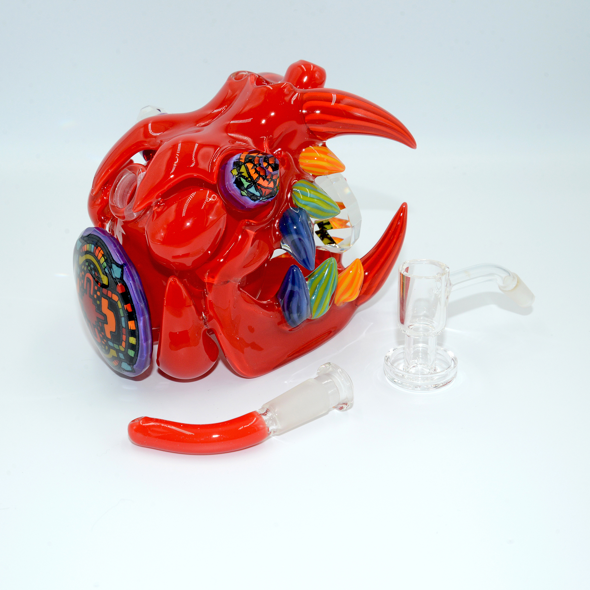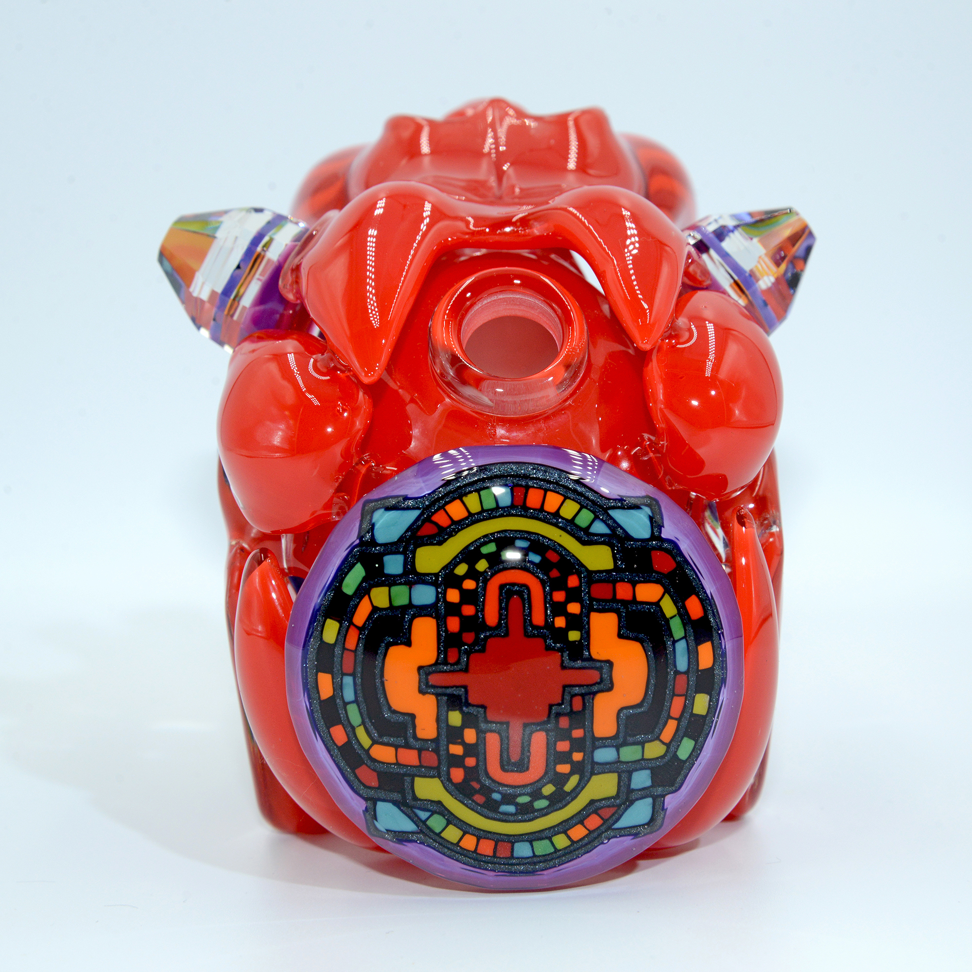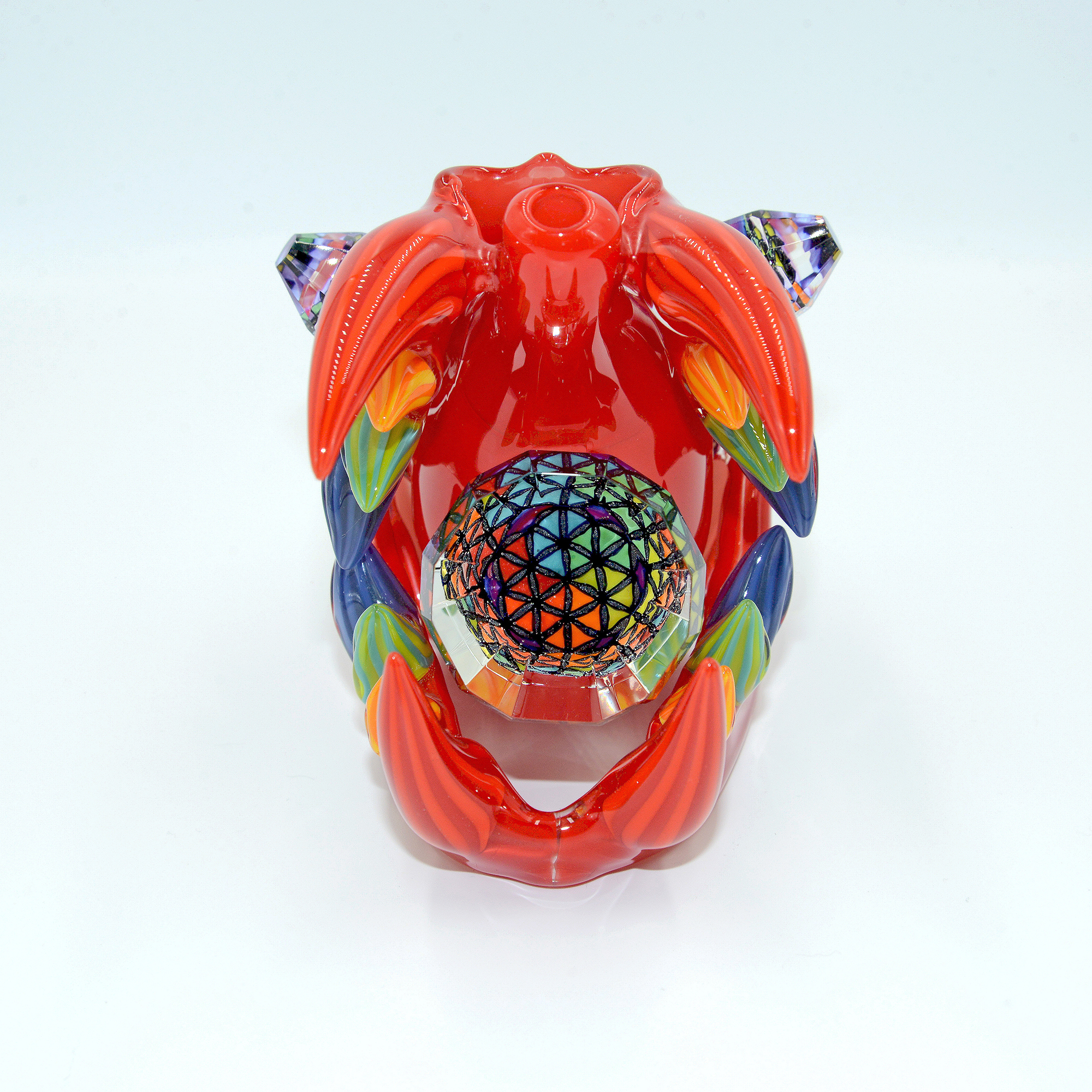 This Wook Cat is so vibrant in the crayon red body colour, perfectly adorned by sacred features drawn in glass and faceted by WJC all over. The giant, fully faceted sacred geometry laden tablet on the front, flower of life pattern diamond in its mouth, rainbow faceted eyes; the list goes on as far as work done. All of this is perfectly encapsulated by how well the piece functions, with a bent 2 hole diffuser at the perfect angle to diffuse the water down and to the side of the hammer bubbler body inside the skull.