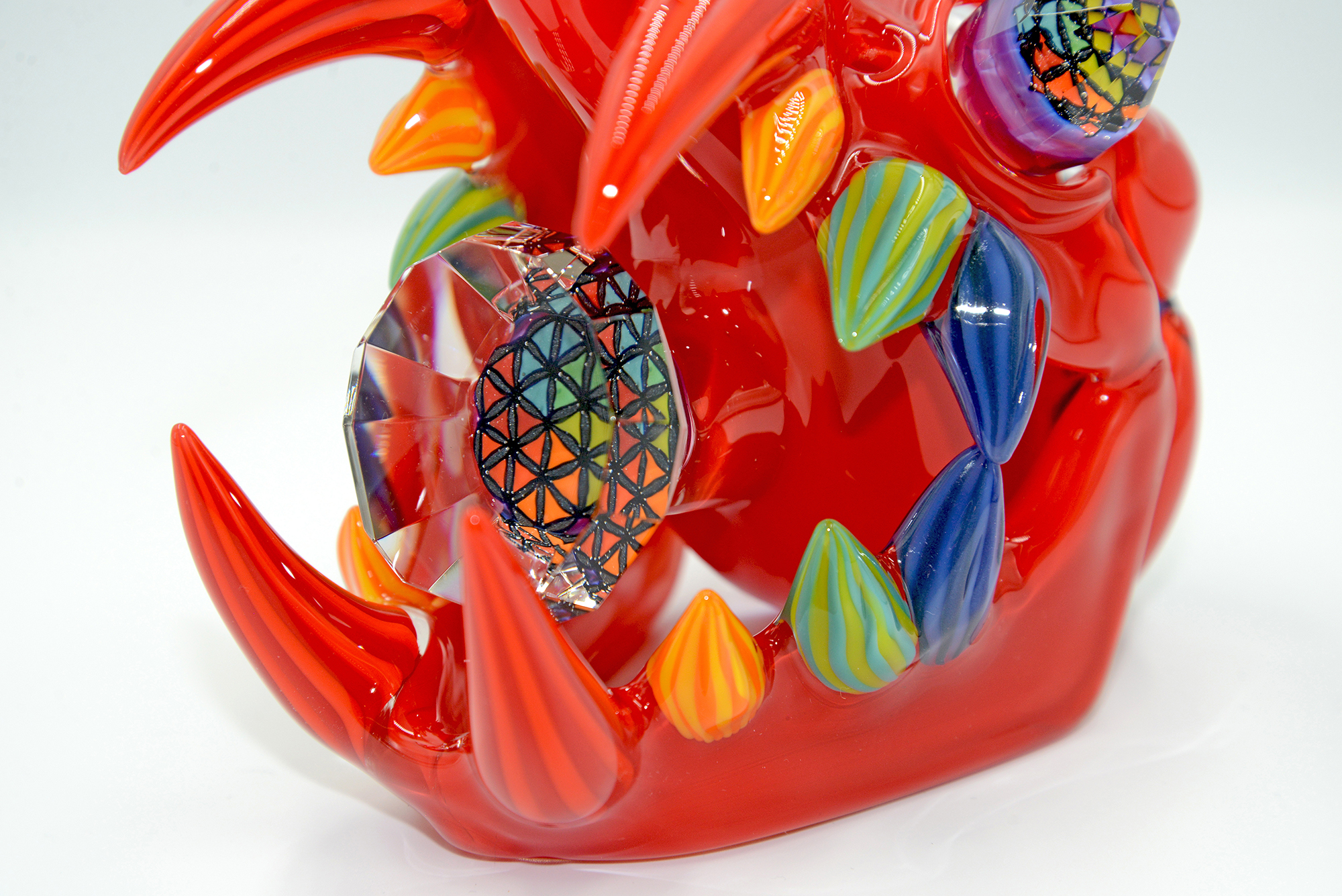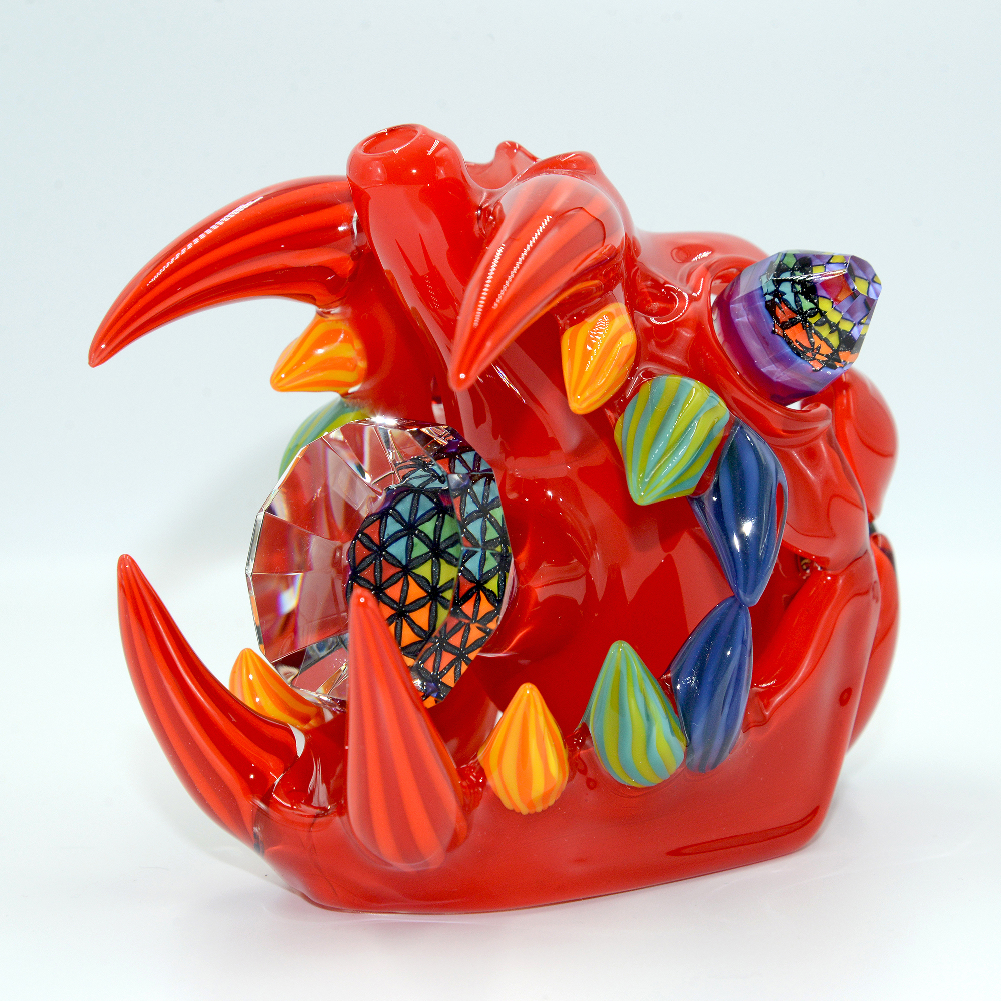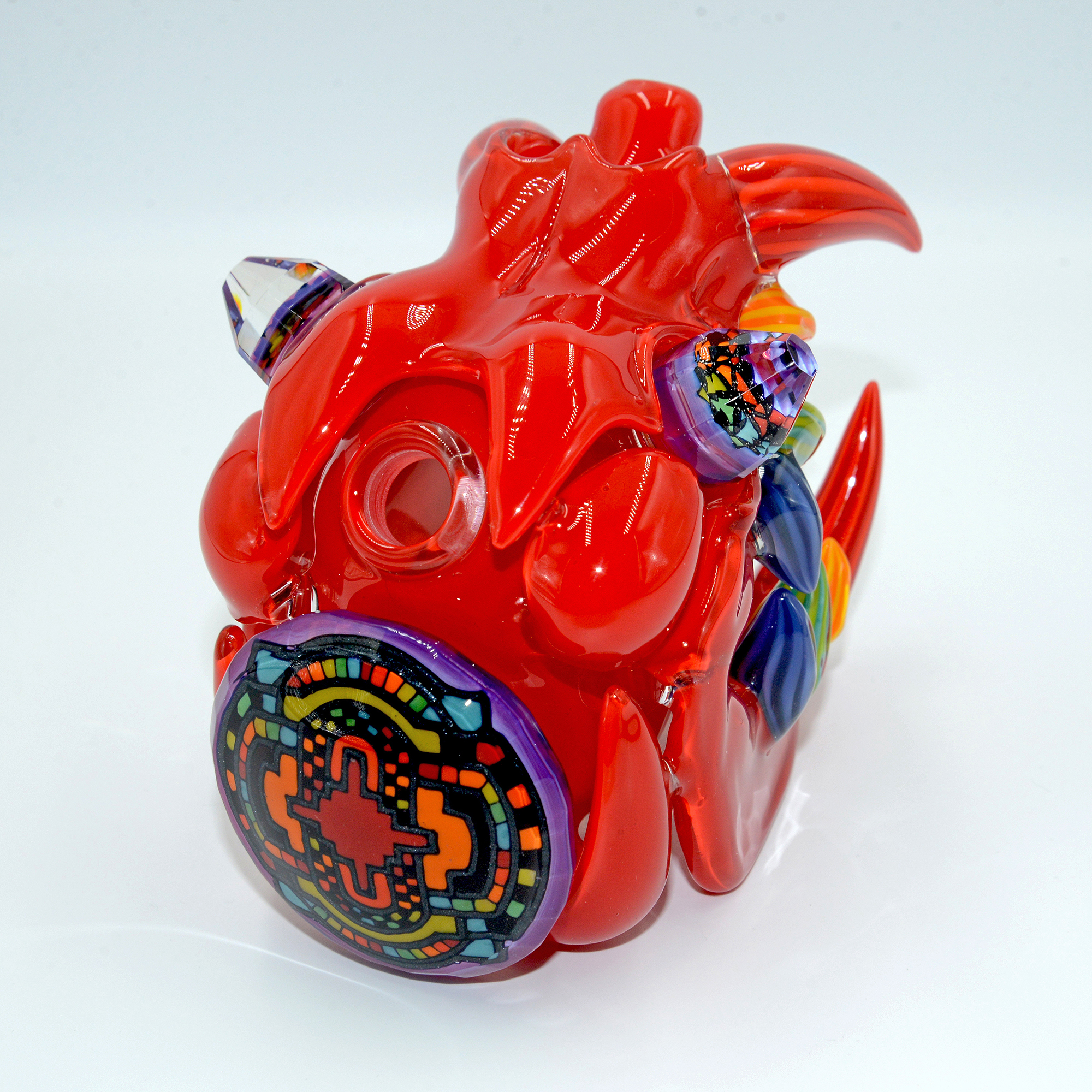 This Wook Cat is so vibrant in the crayon red body colour, perfectly adorned by sacred features drawn in glass and faceted by WJC all over. The giant, fully faceted sacred geometry laden tablet on the front, flower of life pattern diamond in its mouth, rainbow faceted eyes; the list goes on as far as work done. All of this is perfectly encapsulated by how well the piece functions, with a bent 2 hole diffuser at the perfect angle to diffuse the water down and to the side of the hammer bubbler body inside the skull.